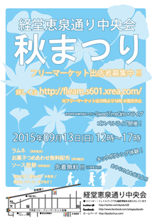 フリーマーケットは2015年09月13日10:00〜16:00に開催します。家庭内の不要品や手作り品などを「秋まつりフリーマーケット」へ出店してみませんか。